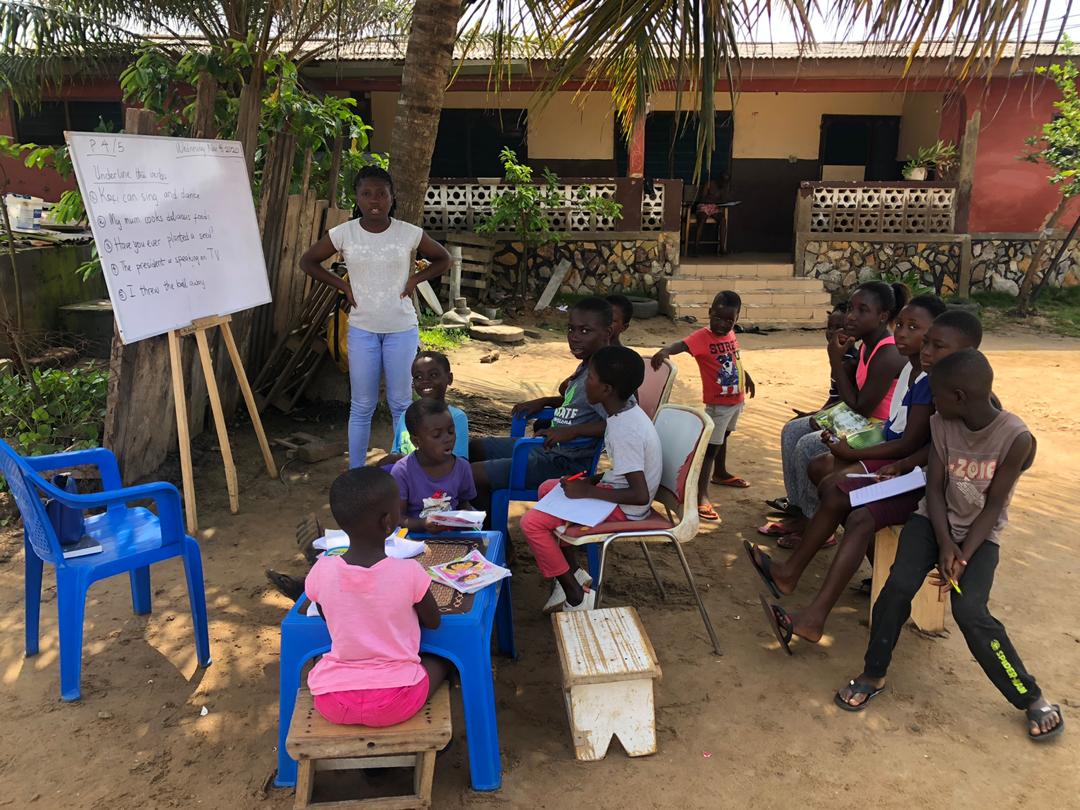 Die Schulen in Ghana werden voraussichtlich erst im Januar 2021 öffnen, deshalb findet Homeschooling über die Smartphones statt. Nicht alle Kinder haben Zugang zu Handys, wir haben deshalb einige gebrauchte Smartphones nach Ghana geschickt. Die Erledigung der Aufgaben wird von Jacob kontrolliert. Einige Kinder haben Unterricht bei Kafui, einer junge Frau, der wir den Schulbesuch ermöglicht haben. Sie möchte Lehrerin werden und wartet auf einen Studienplatz.