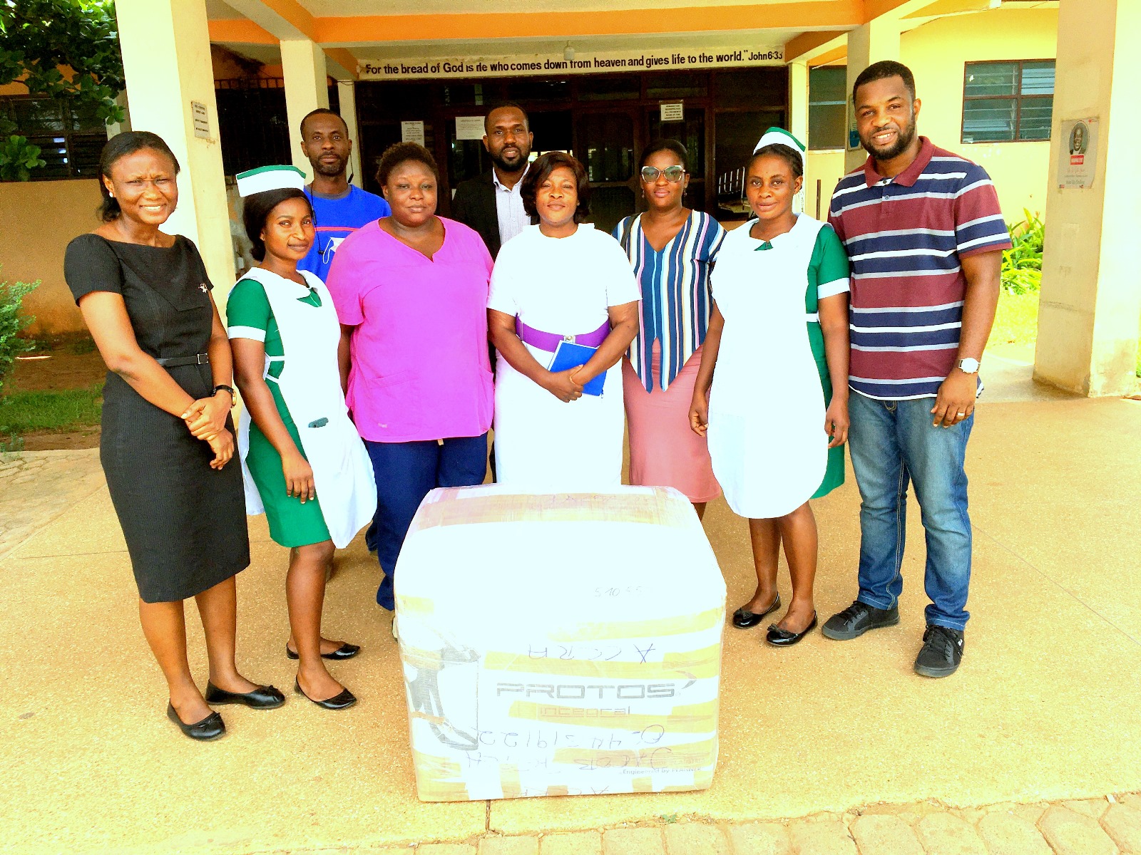 Die Box mit dem medizinischen Material wurde von Jacob Tetteh ( rechts) an das Manna- Hospital übergeben.